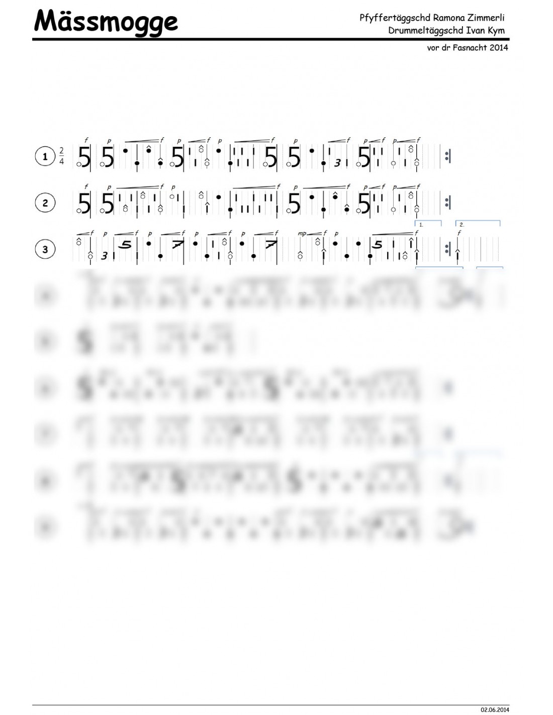 Mässmogge 2 Trommelnoten-Hieroglyphen zu Pfeifermarsch / Kym Ivan